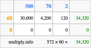 That's all there is to it! As you can see from the box above, the answer to 572 times 60 using the box method is 34,320.