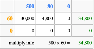 Below is an illustration showing you how to calculate 580 times 60 using the box method, using the instructions above.