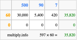 Below is an illustration showing you how to calculate 597 times 60 using the box method, using the instructions above.