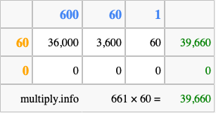 Below is an illustration showing you how to calculate 661 times 60 using the box method, using the instructions above.