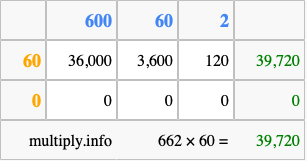 That's all there is to it! As you can see from the box above, the answer to 662 times 60 using the box method is 39,720.