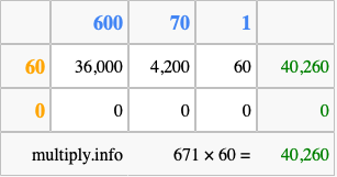 Below is an illustration showing you how to calculate 671 times 60 using the box method, using the instructions above.