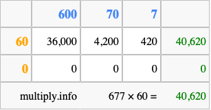 Below is an illustration showing you how to calculate 677 times 60 using the box method, using the instructions above.