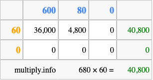 That's all there is to it! As you can see from the box above, the answer to 680 times 60 using the box method is 40,800.