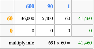 Below is an illustration showing you how to calculate 691 times 60 using the box method, using the instructions above.
