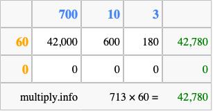 Below is an illustration showing you how to calculate 713 times 60 using the box method, using the instructions above.