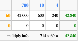 That's all there is to it! As you can see from the box above, the answer to 714 times 60 using the box method is 42,840.