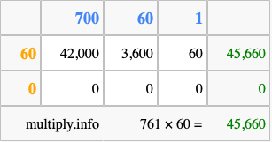 Below is an illustration showing you how to calculate 761 times 60 using the box method, using the instructions above.