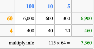 Finally, we add up all the sums we found in step 3 to get our final answer to 115 times 64.