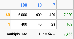 That's all there is to it! As you can see from the box above, the answer to 117 times 64 using the box method is 7,488.