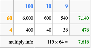 That's all there is to it! As you can see from the box above, the answer to 119 times 64 using the box method is 7,616.