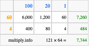 That's all there is to it! As you can see from the box above, the answer to 121 times 64 using the box method is 7,744.