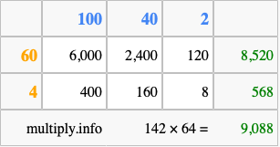 That's all there is to it! As you can see from the box above, the answer to 142 times 64 using the box method is 9,088.