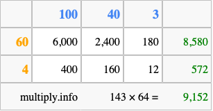 That's all there is to it! As you can see from the box above, the answer to 143 times 64 using the box method is 9,152.