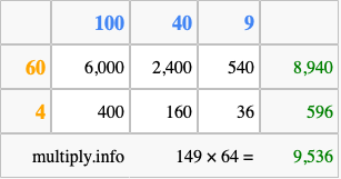 Below is an illustration showing you how to calculate 149 times 64 using the box method, using the instructions above.