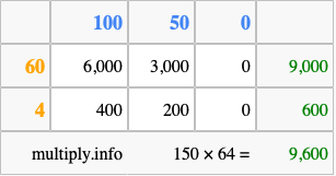 That's all there is to it! As you can see from the box above, the answer to 150 times 64 using the box method is 9,600.