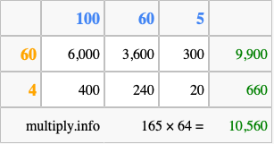 Below is an illustration showing you how to calculate 165 times 64 using the box method, using the instructions above.