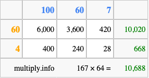 That's all there is to it! As you can see from the box above, the answer to 167 times 64 using the box method is 10,688.