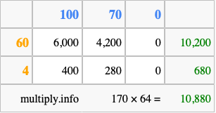 That's all there is to it! As you can see from the box above, the answer to 170 times 64 using the box method is 10,880.