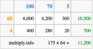 Finally, we add up all the sums we found in step 3 to get our final answer to 175 times 64.
