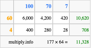 That's all there is to it! As you can see from the box above, the answer to 177 times 64 using the box method is 11,328.