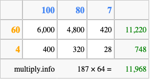 That's all there is to it! As you can see from the box above, the answer to 187 times 64 using the box method is 11,968.