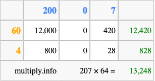 That's all there is to it! As you can see from the box above, the answer to 207 times 64 using the box method is 13,248.