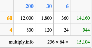 Finally, we add up all the sums we found in step 3 to get our final answer to 236 times 64.