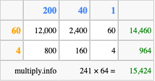 That's all there is to it! As you can see from the box above, the answer to 241 times 64 using the box method is 15,424.