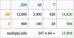 Finally, we add up all the sums we found in step 3 to get our final answer to 247 times 64.