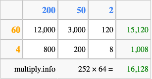 Finally, we add up all the sums we found in step 3 to get our final answer to 252 times 64.
