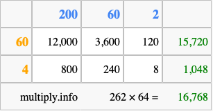 That's all there is to it! As you can see from the box above, the answer to 262 times 64 using the box method is 16,768.