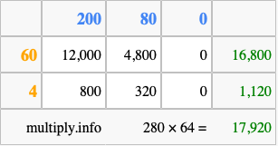 That's all there is to it! As you can see from the box above, the answer to 280 times 64 using the box method is 17,920.