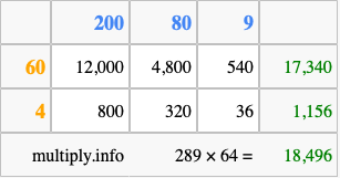 That's all there is to it! As you can see from the box above, the answer to 289 times 64 using the box method is 18,496.