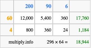 That's all there is to it! As you can see from the box above, the answer to 296 times 64 using the box method is 18,944.