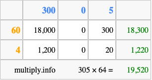 Below is an illustration showing you how to calculate 305 times 64 using the box method, using the instructions above.