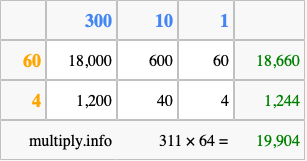That's all there is to it! As you can see from the box above, the answer to 311 times 64 using the box method is 19,904.