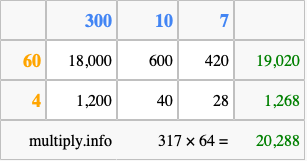 Below is an illustration showing you how to calculate 317 times 64 using the box method, using the instructions above.