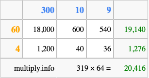 Below is an illustration showing you how to calculate 319 times 64 using the box method, using the instructions above.