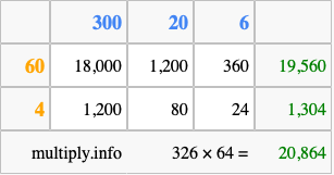 Finally, we add up all the sums we found in step 3 to get our final answer to 326 times 64.