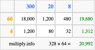 That's all there is to it! As you can see from the box above, the answer to 328 times 64 using the box method is 20,992.