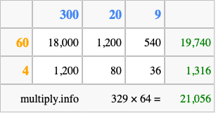 That's all there is to it! As you can see from the box above, the answer to 329 times 64 using the box method is 21,056.