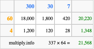 That's all there is to it! As you can see from the box above, the answer to 337 times 64 using the box method is 21,568.