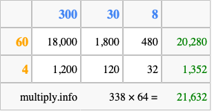 That's all there is to it! As you can see from the box above, the answer to 338 times 64 using the box method is 21,632.