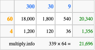 Finally, we add up all the sums we found in step 3 to get our final answer to 339 times 64.