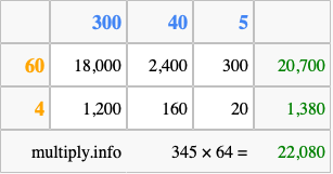 Finally, we add up all the sums we found in step 3 to get our final answer to 345 times 64.