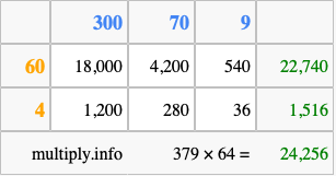 That's all there is to it! As you can see from the box above, the answer to 379 times 64 using the box method is 24,256.