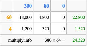 Finally, we add up all the sums we found in step 3 to get our final answer to 380 times 64.