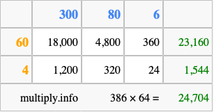 Finally, we add up all the sums we found in step 3 to get our final answer to 386 times 64.