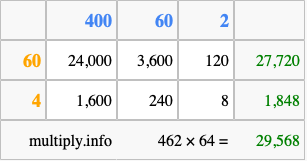 Below is an illustration showing you how to calculate 462 times 64 using the box method, using the instructions above.